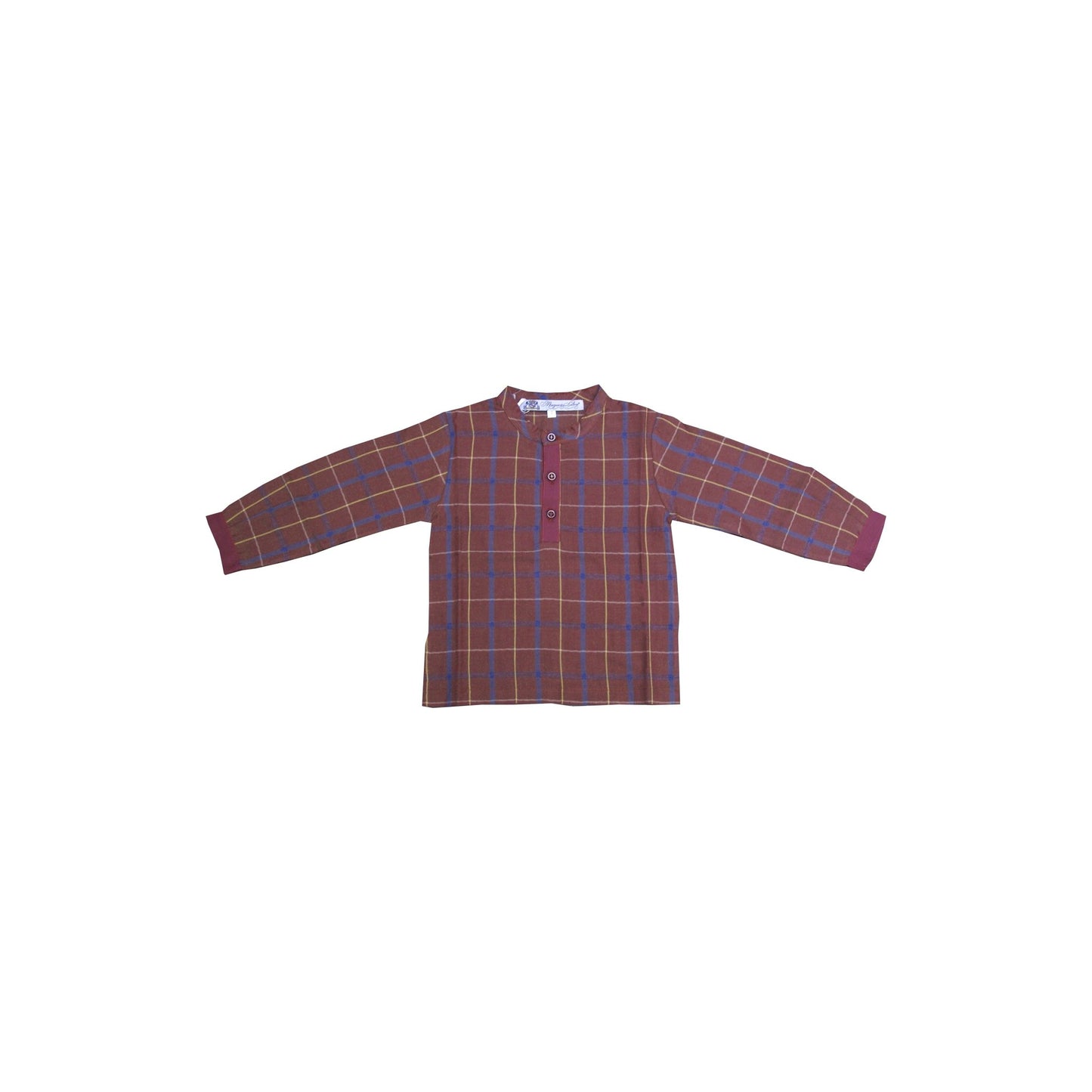 Long sleeve boys shirt made with brushed cotton blend fabric with tunisian collar with buttons and French ribbon detail.
