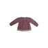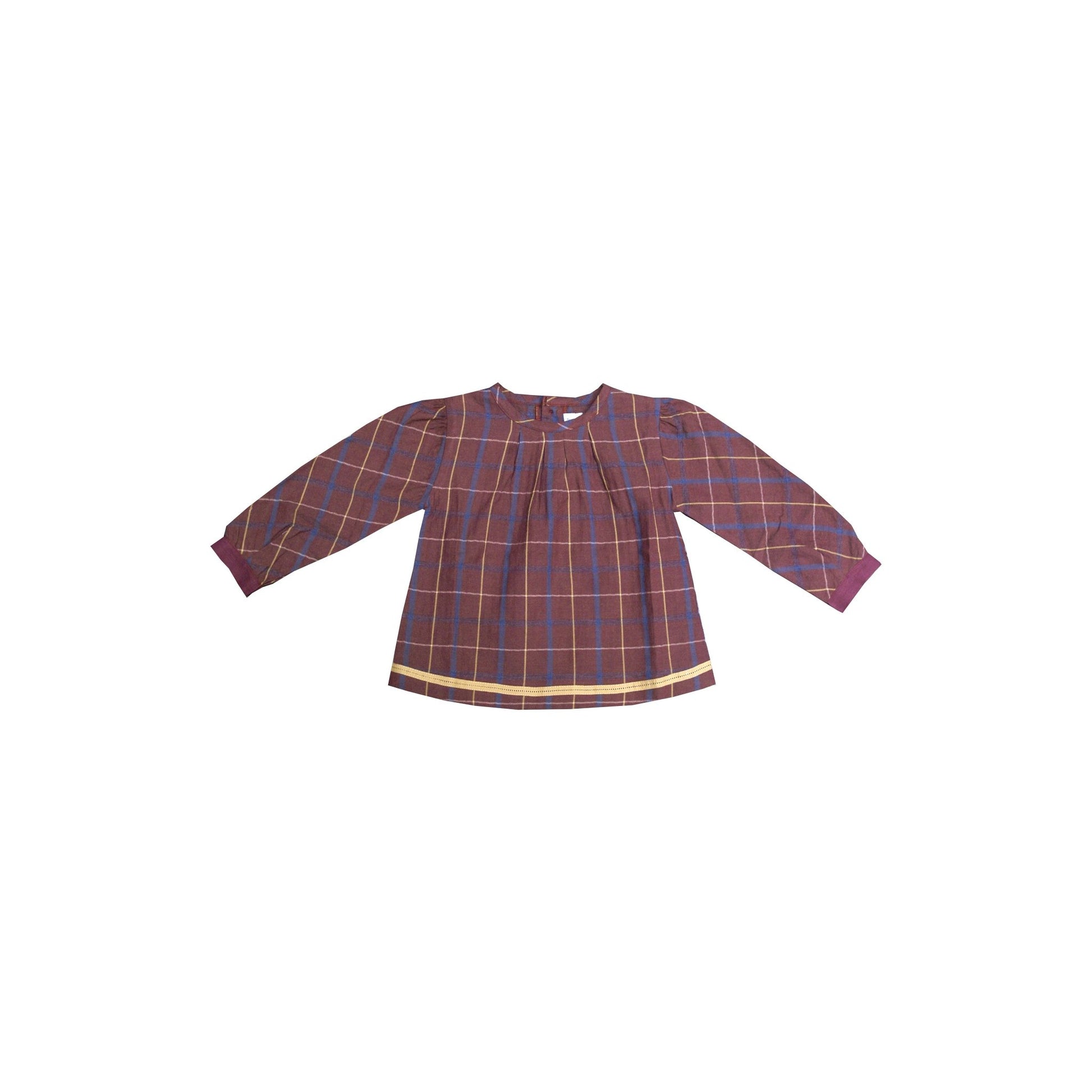ネックラインにギャザーをあしらった長袖トップ、フレンチリボンのディテール、背中にボタン。